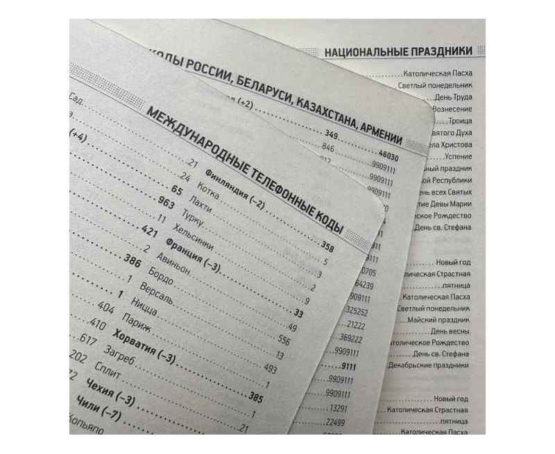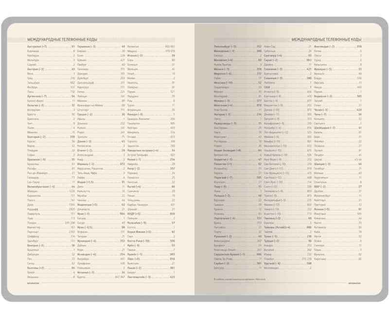 • справочная информация на 19 страницах (аэропорты Европы, штрихкоды, международные телефонные коды, цифровые автомобильные коды, энергетическая и питательная ценность продуктов, национальные и религиозные праздники, единицы измерения, страны мира, размеры одежды, форматы бумаги и др.);