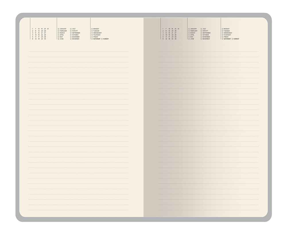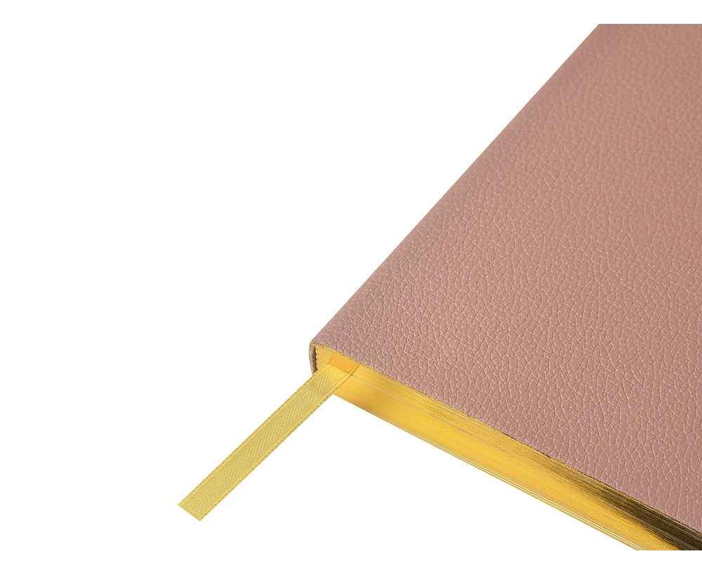 Внутри — недатированный блок формата А5 (125×200 мм) на бежевой бумаге 80 г/м². Книжный переплёт хорошо раскрывается, а скруглённые углы одновременно придают ежедневнику премиальный вид и защищают края при носке. Завершают детали ляссе в цвет обложки и петля для ручки — чтобы всё нужное было под рукой.