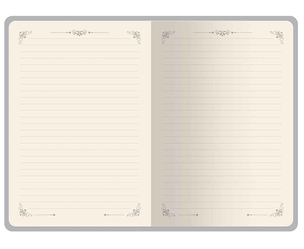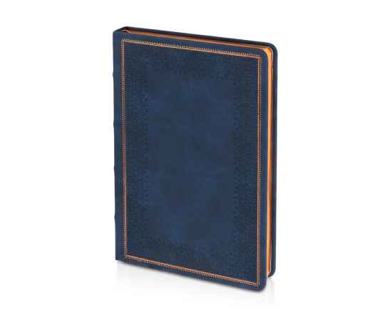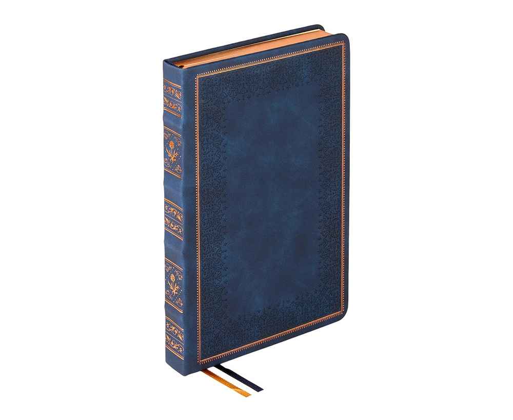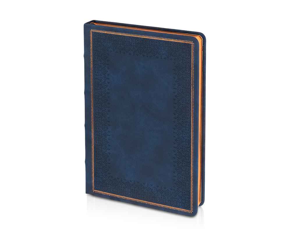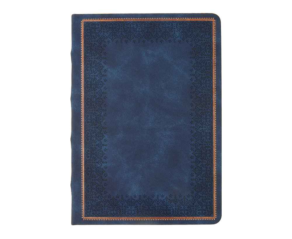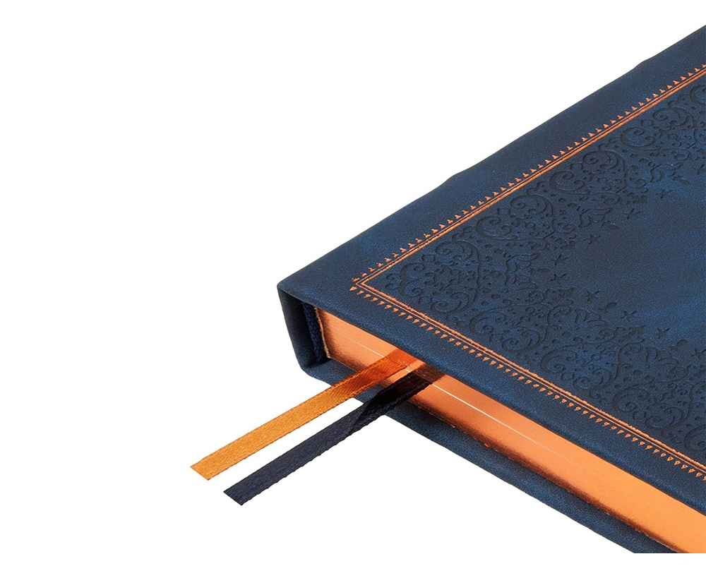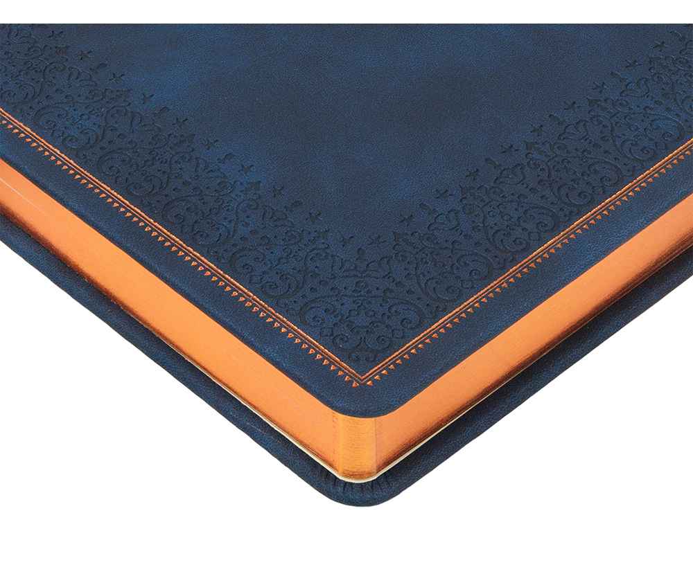 Недатированный ежедневник Royal формата А5 с твердой обложкой из искусственной кожи с имитацией нубука украшен художественным бронзовым и блинтовым тиснением. Внутри 256 страниц, выполненных из качественной бежевой бумаги в линейку плотностью 100 г/м². Два шелковых ляссе в цвет обреза блока и обложки облегчают навигацию по записям. Французский корешок дополнительно декорирован изящным бронзовым тиснением в виде виньеток. Скругленные углы обложки и блока подчеркивают стильный дизайн изделия, а блеск бронзового обреза дарит ежедневнику благородный и роскошный внешний вид.