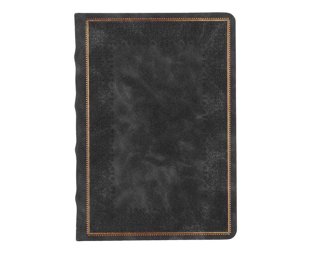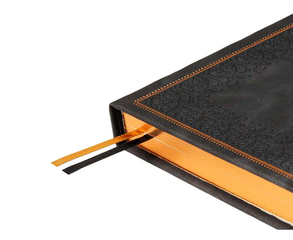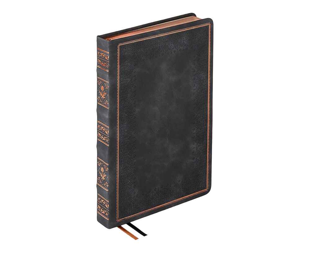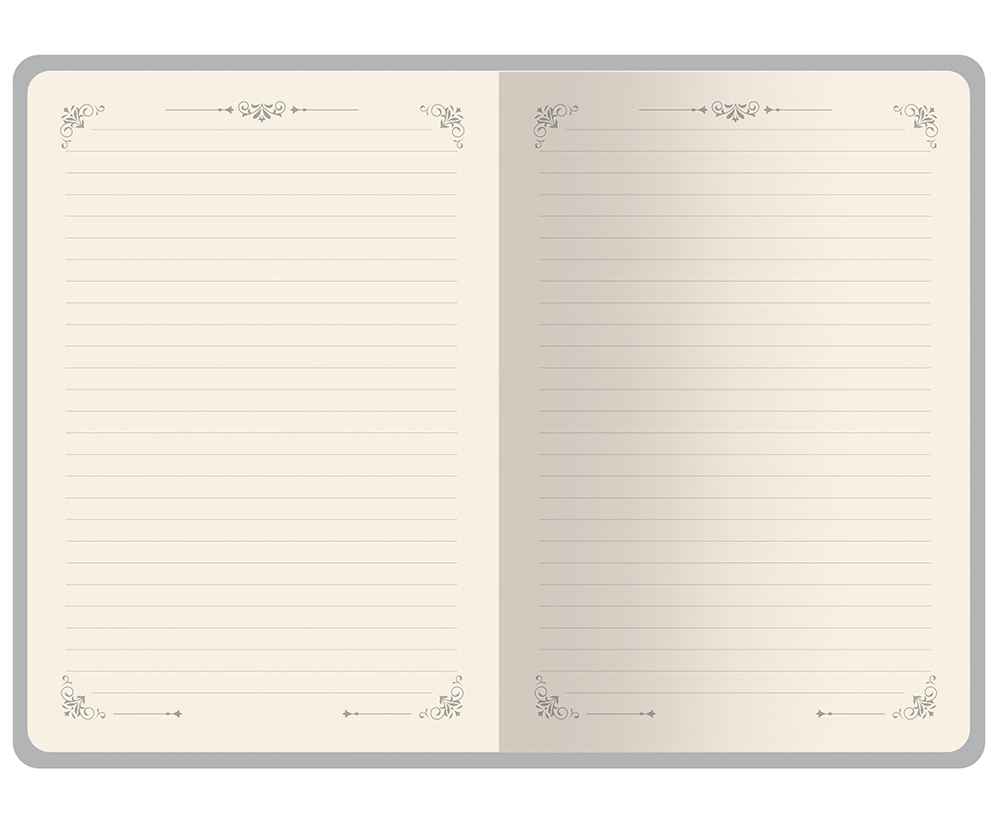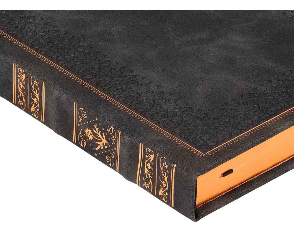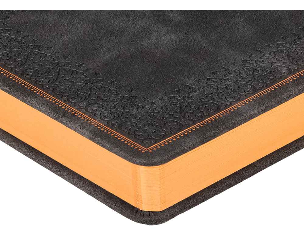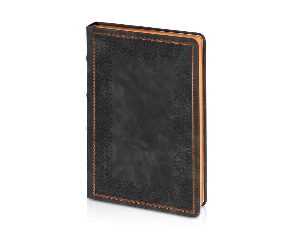Недатированный ежедневник Royal формата А5 с твердой обложкой из искусственной кожи с имитацией нубука украшен художественным бронзовым и блинтовым тиснением. Внутри 256 страниц, выполненных из качественной бежевой бумаги в линейку плотностью 100 г/м². Два шелковых ляссе в цвет обреза блока и обложки облегчают навигацию по записям. Французский корешок дополнительно декорирован изящным бронзовым тиснением в виде виньеток. Скругленные углы обложки и блока подчеркивают стильный дизайн изделия, а блеск бронзового обреза дарит ежедневнику благородный и роскошный внешний вид.