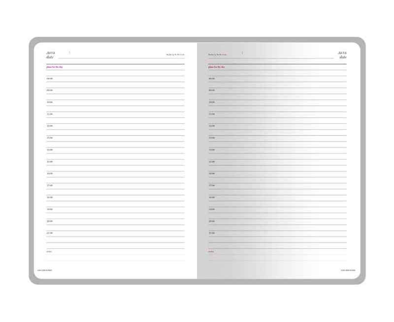 В ежедневнике Sidney Nebraska есть полезная справочная информация и телефонная книга на 18 листов, а также 272 страницы для записи идей, мыслей и составления рабочих планов. Для изготовления страниц используется качественный белый офсет повышенной плотности (70 г/кв м) с серебристым срезом, который производится в Японии и подходит для всех видов чернил. Разметка блока с указанием времени позволяет планировать дела с точностью до 1 часа.