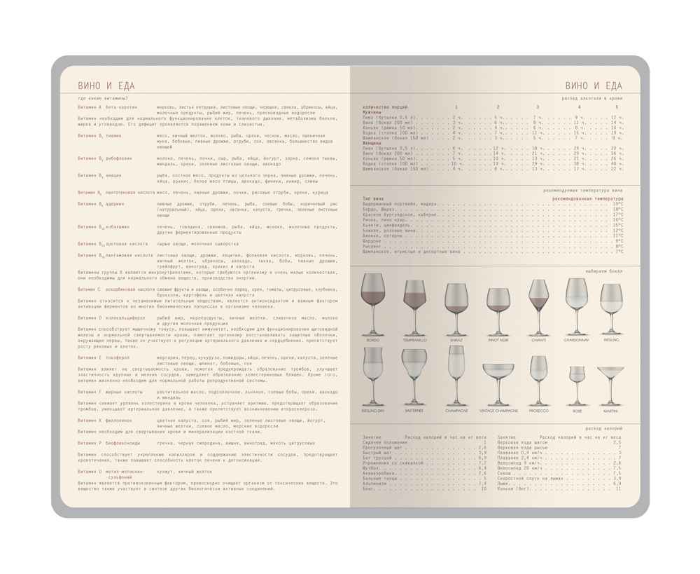 Ежедневник формата А5 имеет внутренний блок из 272 страниц. Блок изготовлен из бежевой бумаги плотностью 70 г/м2 и содержит: