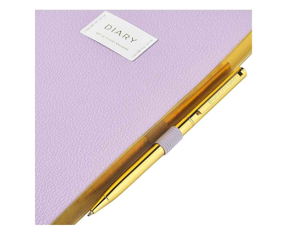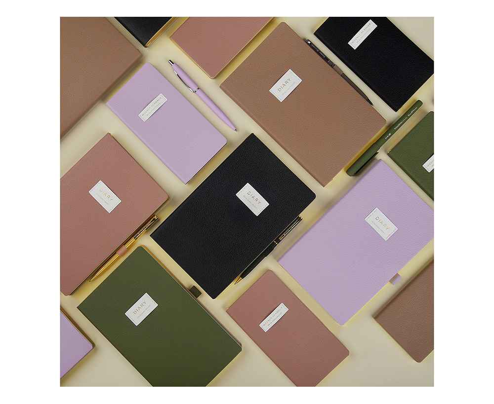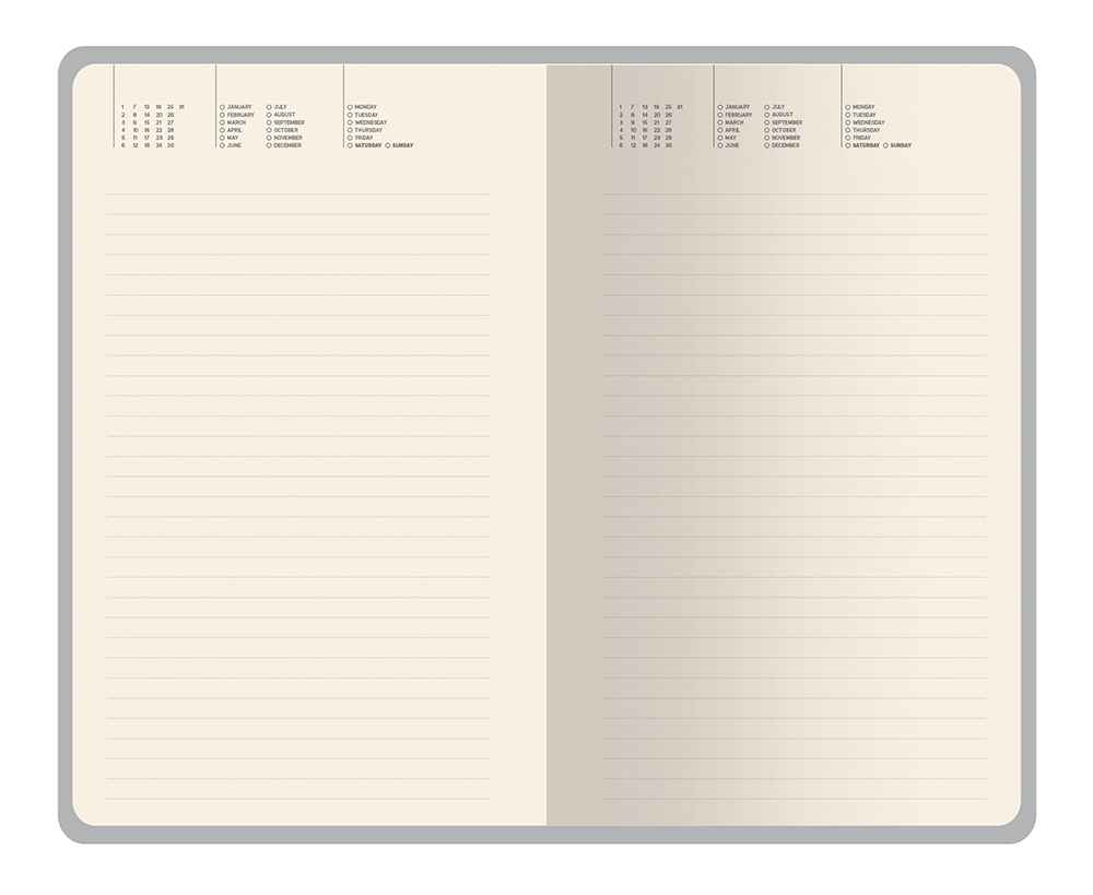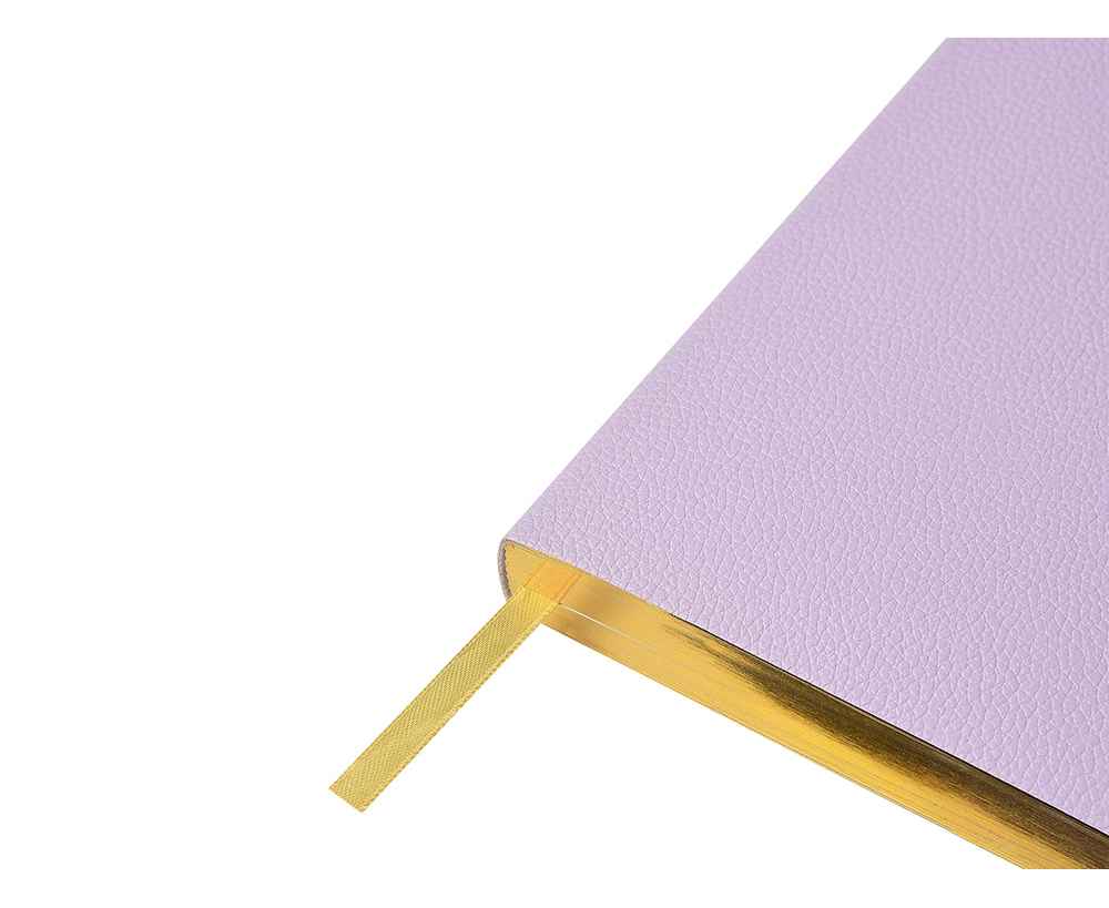 Внутри — недатированный блок формата А5 (125×200 мм) на бежевой бумаге 80 г/м². Книжный переплёт хорошо раскрывается, а скруглённые углы одновременно придают ежедневнику премиальный вид и защищают края при носке. Завершают детали ляссе в цвет обложки и петля для ручки — чтобы всё нужное было под рукой.