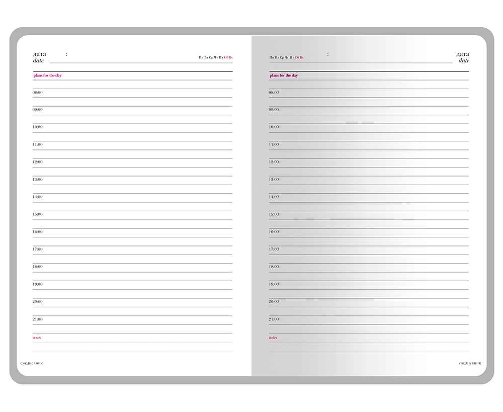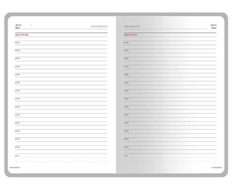 Недатированные страницы в серую линейку имеют отдельное место для проставления числа месяца и дня недели. Справочный блок на 14 страницах содержит полезную информацию из различных областей.
