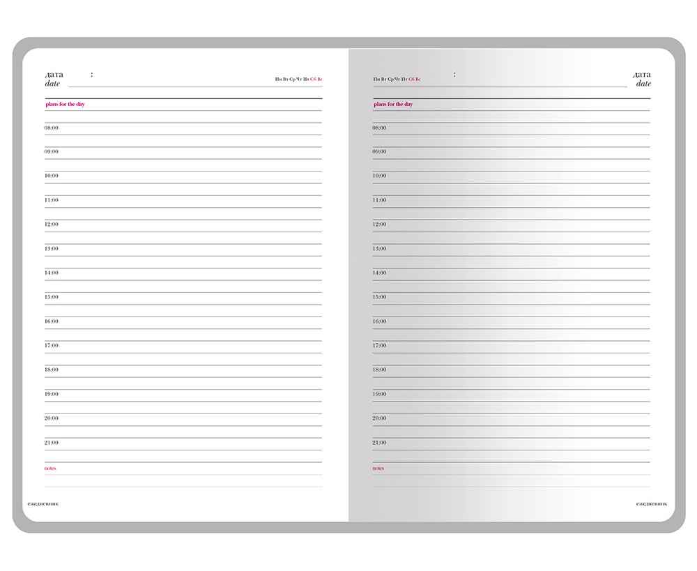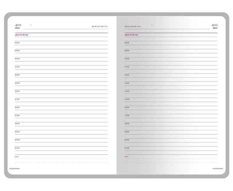 Недатированные страницы в серую линейку имеют отдельное место для проставления числа месяца и дня недели. Справочный блок на 14 страницах содержит полезную информацию из различных областей.