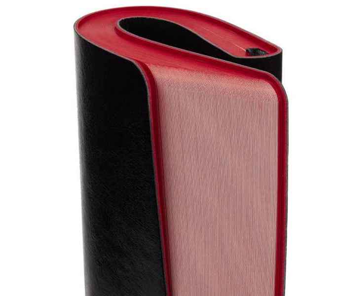 Ежедневник с гибкой обложкой, выполнен из материала Vintage, черный АА и Latte, красный PP, дополнен ляссе в цвет обложки.