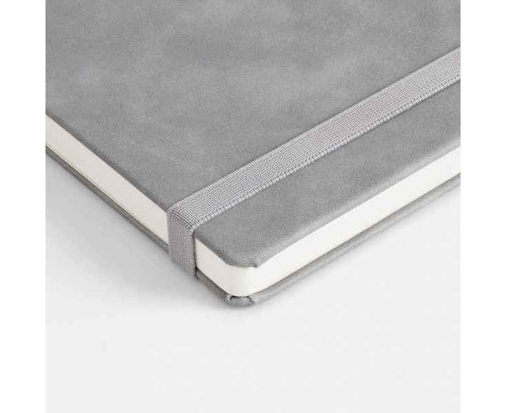 Ежедневник с твердой обложкой, выполнен из материала Nubuck Touch, серый СС, дополнен ляссе темно-серого цвета.
