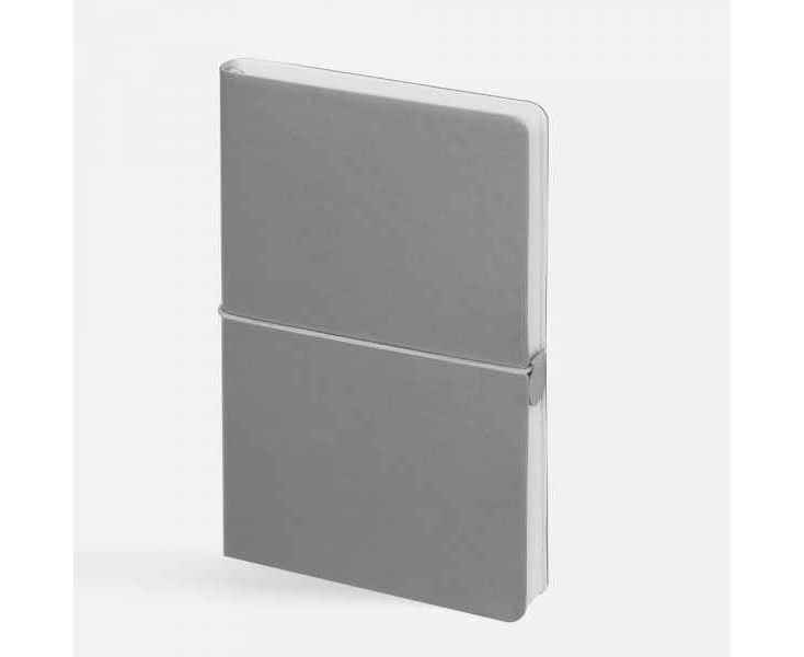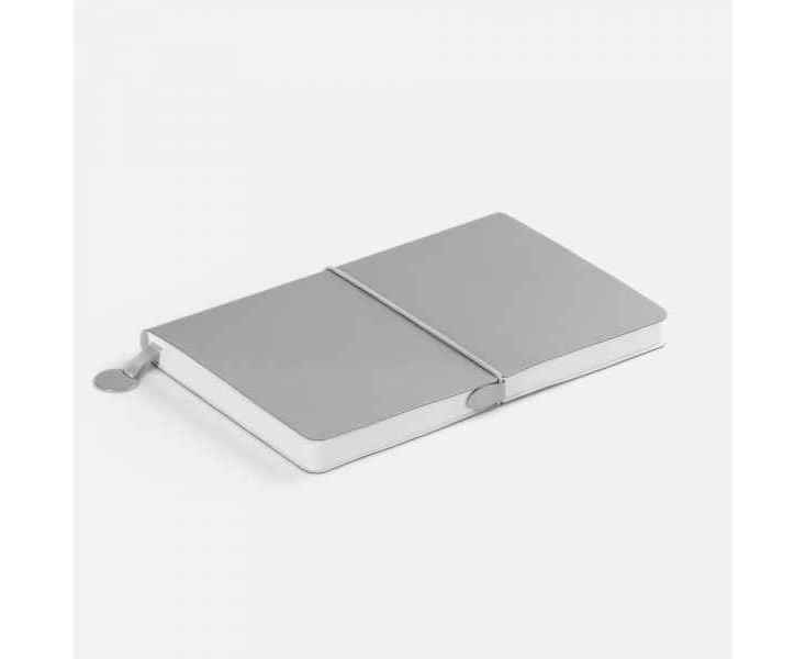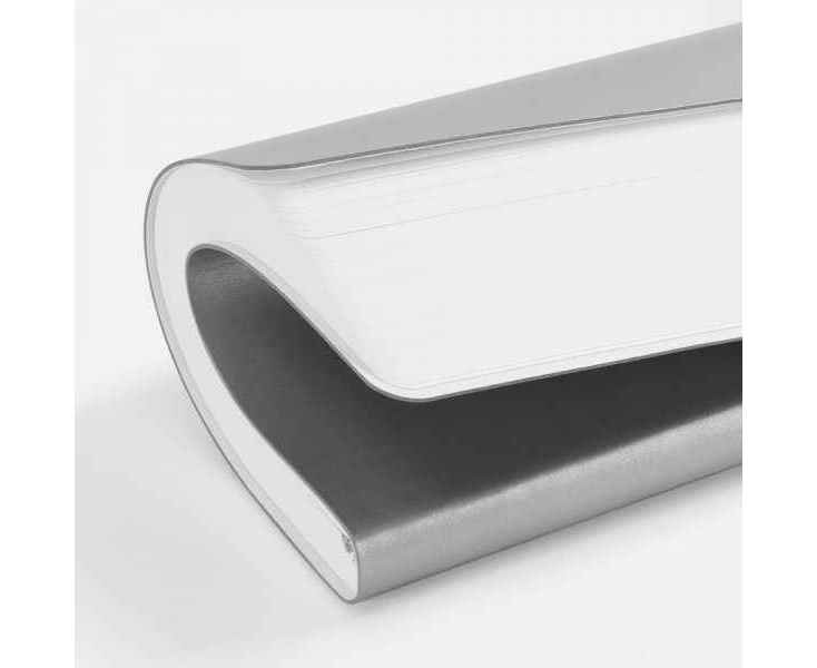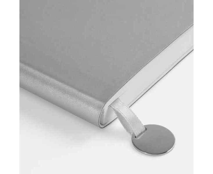Ежедневник с гибкой обложкой, выполнен из материала Waltz, серебристый DD, дополнен ляссе в цвет обложки с металлическим шильдом.