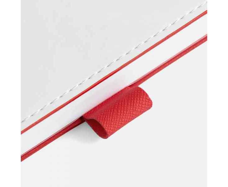 Гибкая обложка, материал обложки — Soft Touch, белый BB; внутренний материал — Latte красный РР; материал петли для ручки — Nice Touch Ultra, красный РР. Срез обложки окрашен в красный цвет.