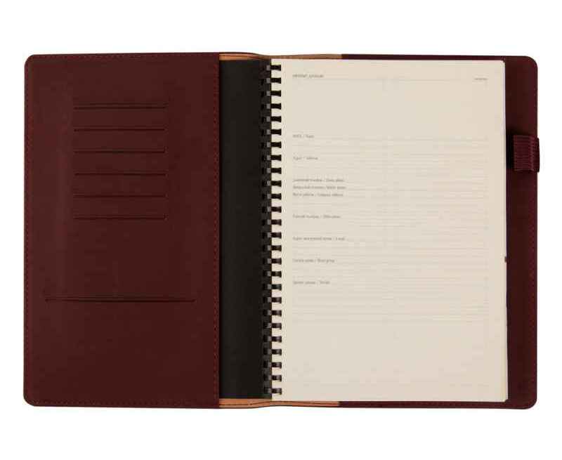 Блок является сменным и вставляется внутрь обложки. С внутренней стороны обложка имеет вырубные отделения для визиток и кредитных карт, а также петлю для ручки на резинке. Для хранения чеков, записок и бумаг внутри расположен прозрачный пластиковый конверт.