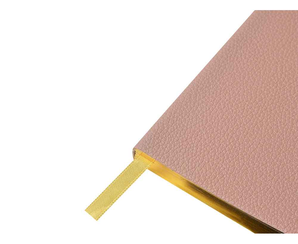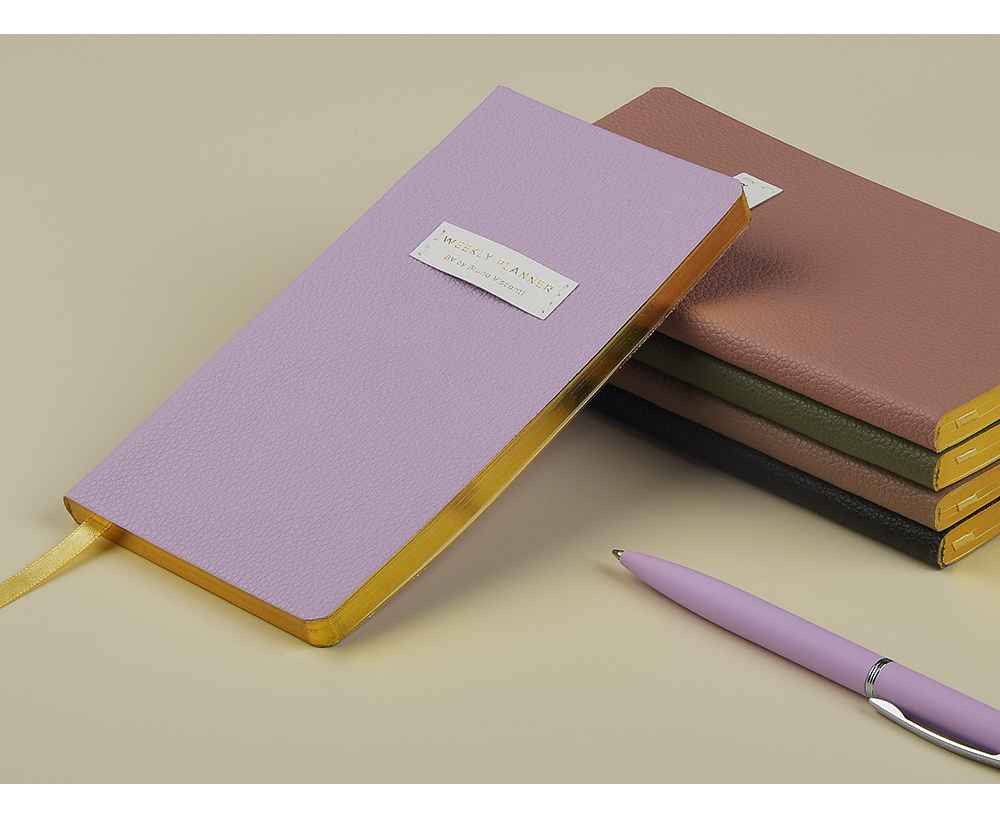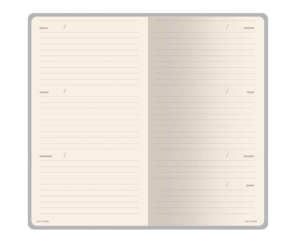 Внутри — недатированный блок формата А6 (84×160 мм) на бежевой бумаге 80 г/м². Книжный переплёт хорошо раскрывается, а скруглённые углы одновременно придают еженедельнику премиальный вид и защищают края при носке. Ляссе‑закладка выполнена в цвет обложки и помогает быстро находить нужную страницу.