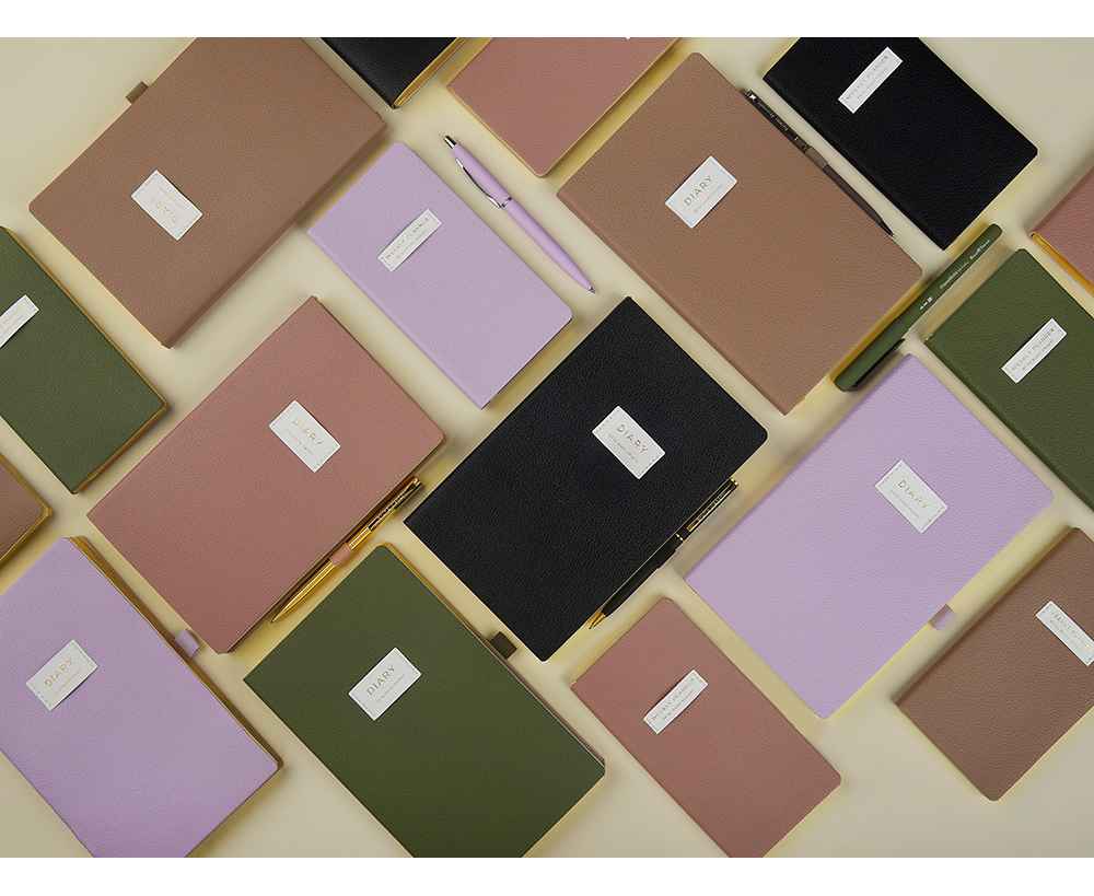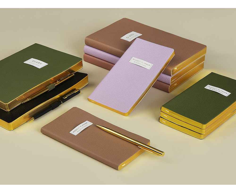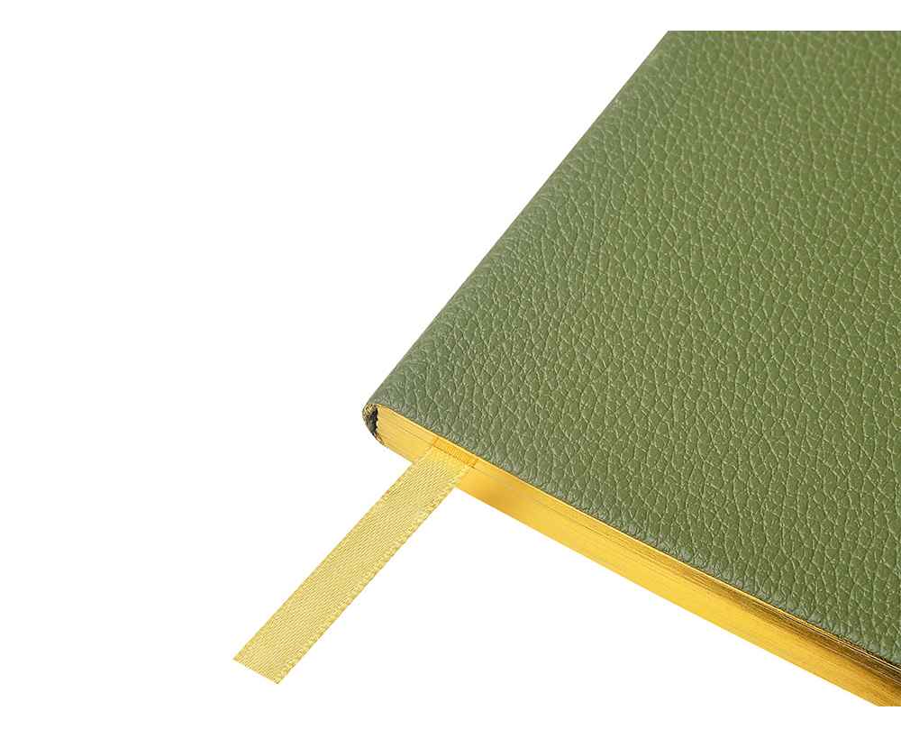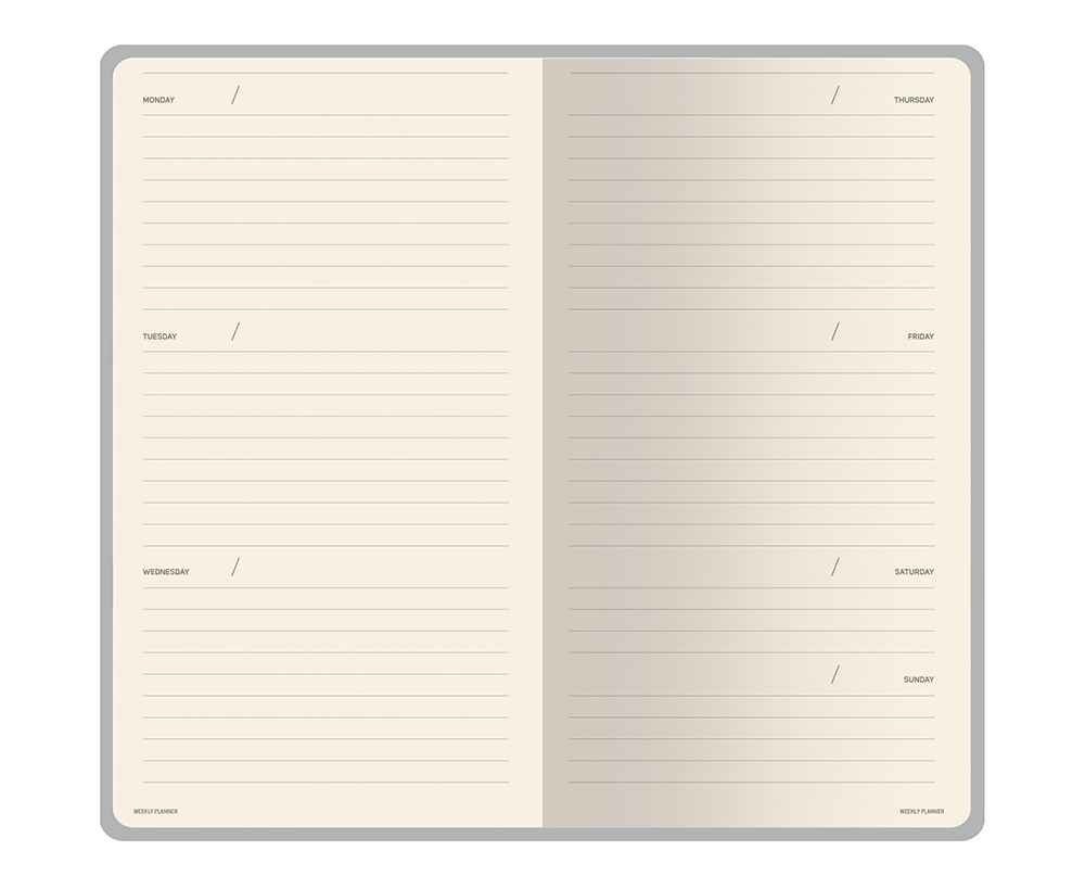 Внутри — недатированный блок формата А6 (84×160 мм) на бежевой бумаге 80 г/м². Книжный переплёт хорошо раскрывается, а скруглённые углы одновременно придают еженедельнику премиальный вид и защищают края при носке. Ляссе‑закладка выполнена в цвет обложки и помогает быстро находить нужную страницу.