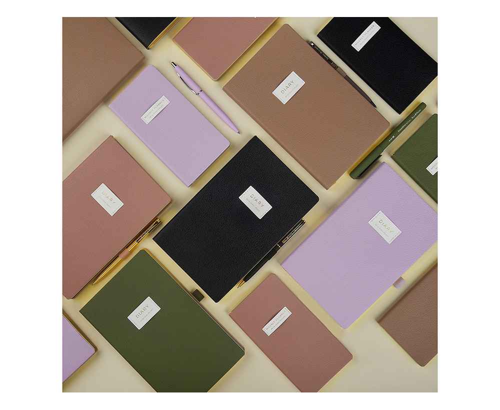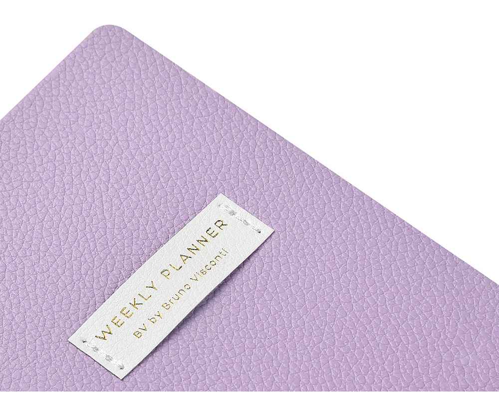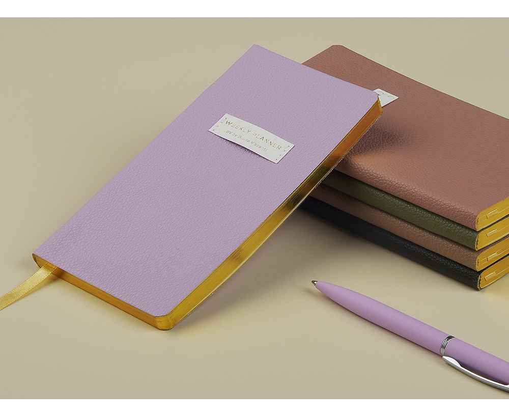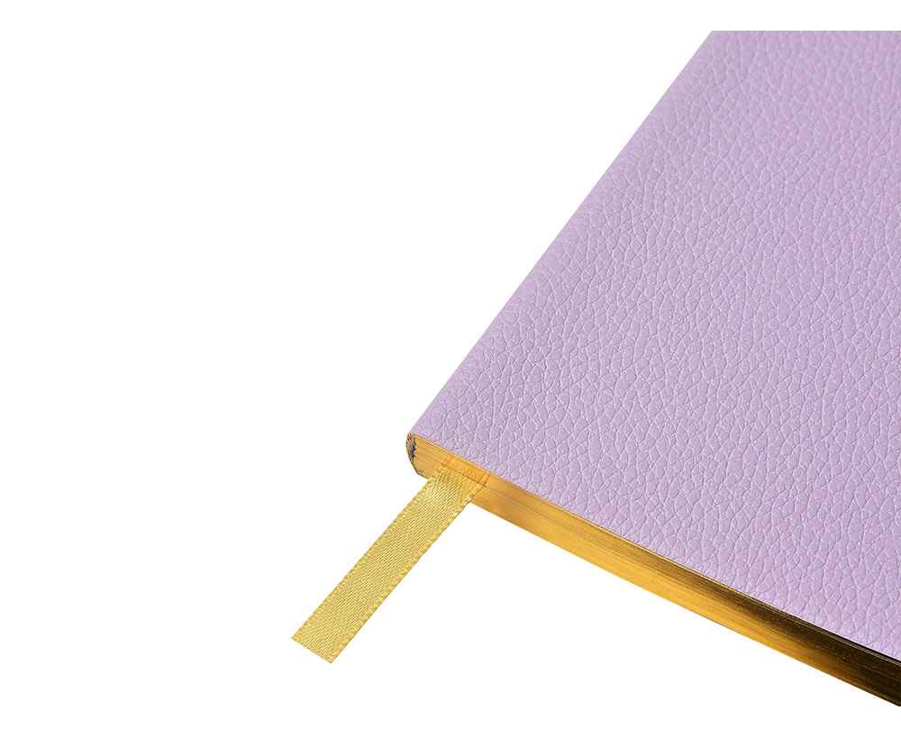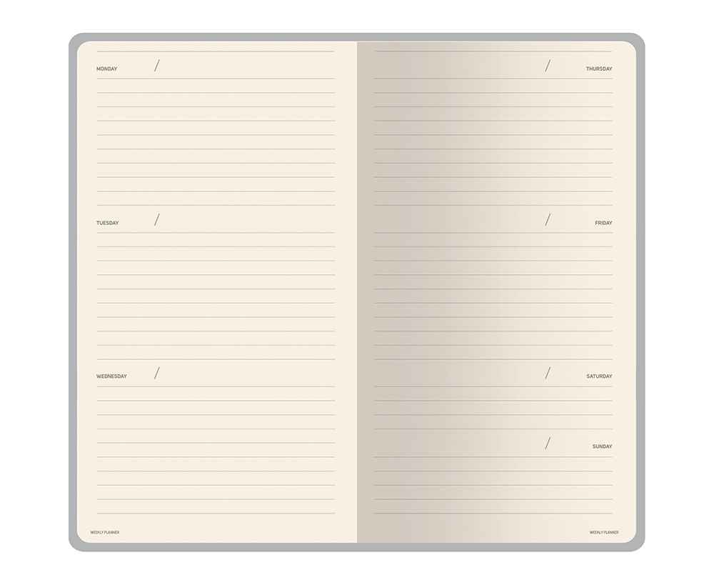 Внутри — недатированный блок формата А6 (84×160 мм) на бежевой бумаге 80 г/м². Книжный переплёт хорошо раскрывается, а скруглённые углы одновременно придают еженедельнику премиальный вид и защищают края при носке. Ляссе‑закладка выполнена в цвет обложки и помогает быстро находить нужную страницу.