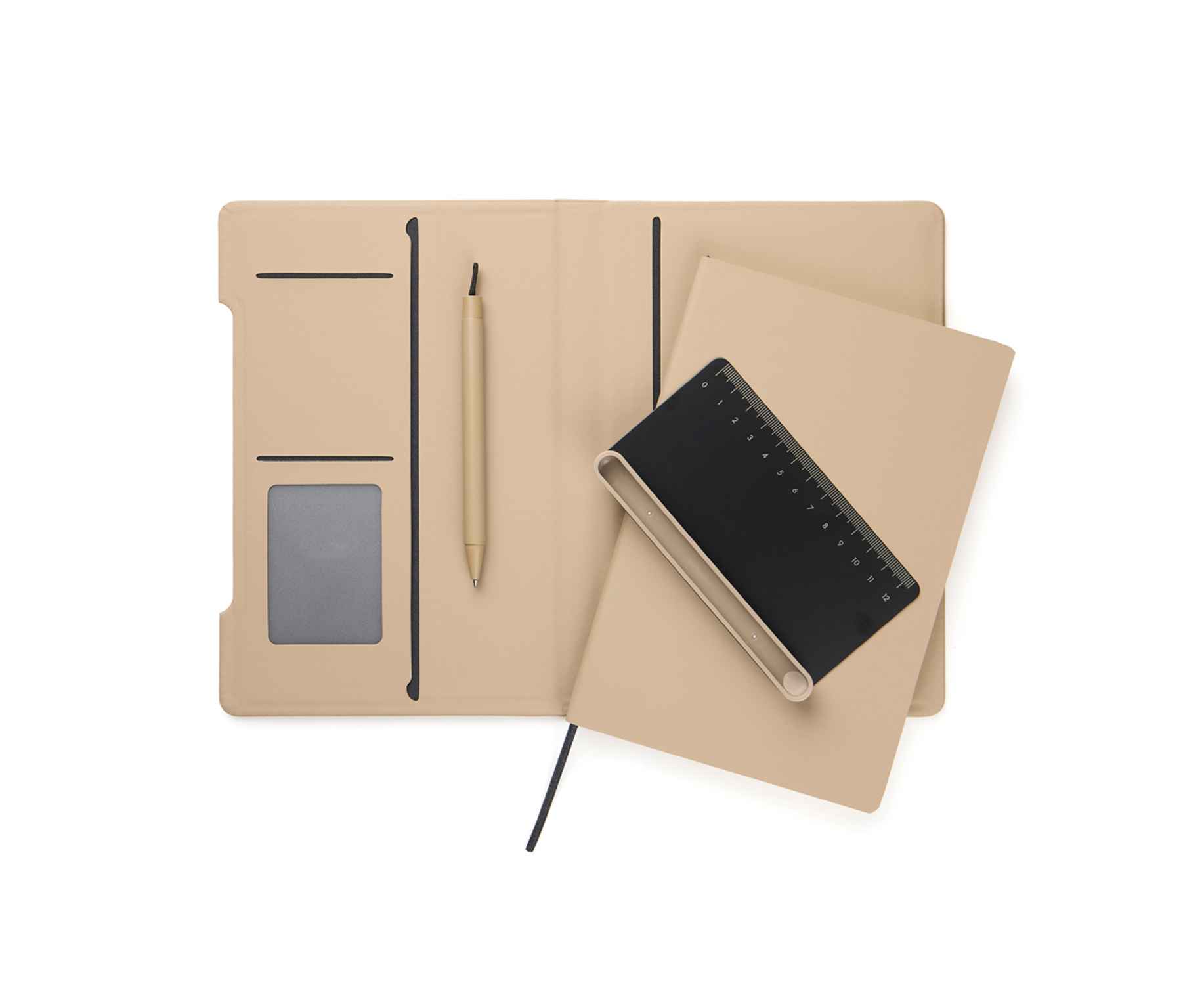 Изготовлен из переработанной бумаги, сертифицированной по стандарту RCS, с обложкой в классическом стиле Baltimore с матовым PU-покрытием, что делает его не только функциональным, но и визуально привлекательным. Магнитная линейка служит одновременно и линейкой, и держателем для ручки. Шариковая ручка в цвет набора с синими чернилами входит в комплект. Держатель для ручки легко трансформируется в подставку для телефона. Внутри обложки есть кармашки для карт, а блокнот легко заменить новым блоком, когда закончится старый.