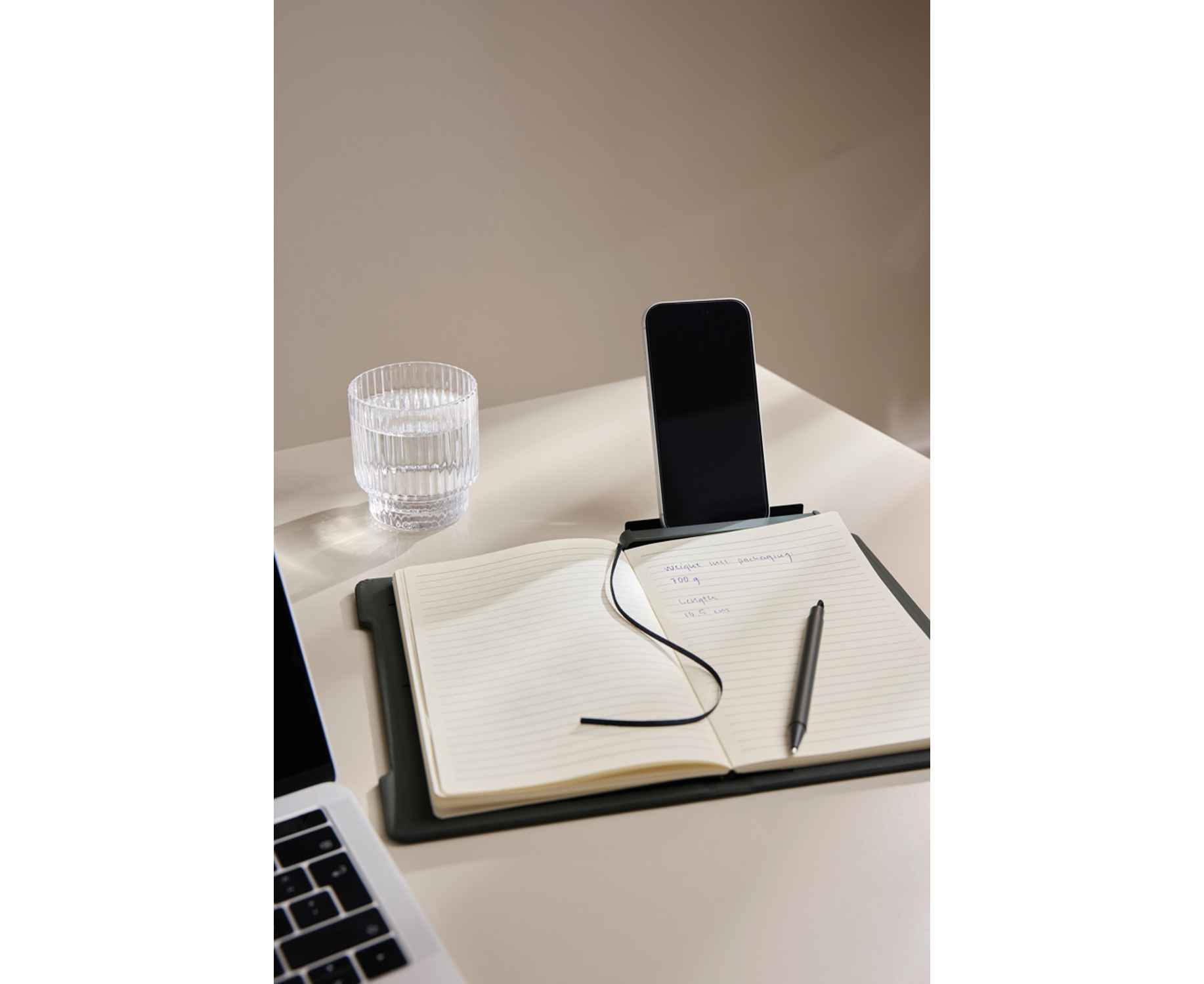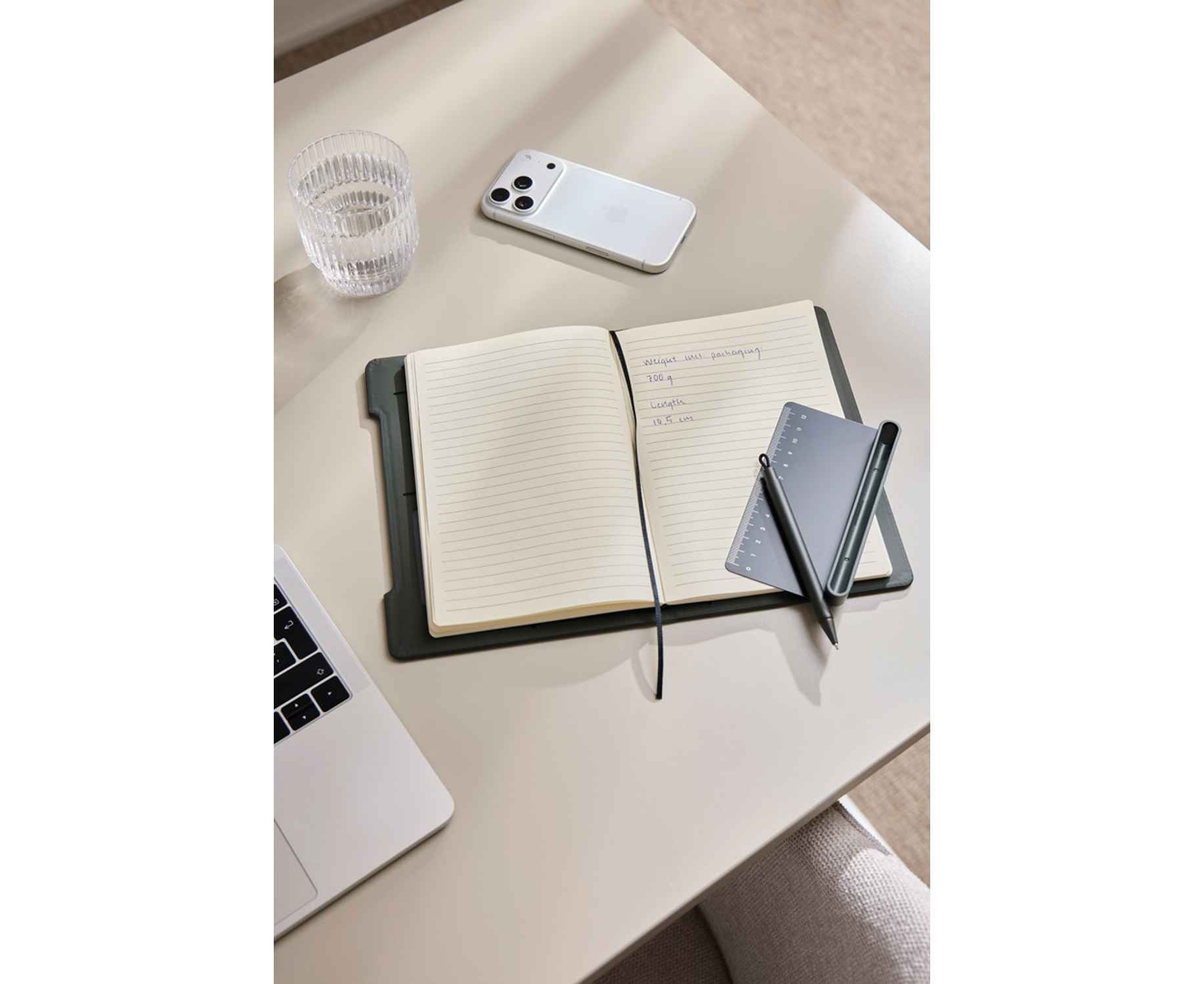 Изготовлен из переработанной бумаги, сертифицированной по стандарту RCS, с обложкой в классическом стиле Baltimore с матовым PU-покрытием, что делает его не только функциональным, но и визуально привлекательным. Магнитная линейка служит одновременно и линейкой, и держателем для ручки. Шариковая ручка в цвет набора с синими чернилами входит в комплект. Держатель для ручки легко трансформируется в подставку для телефона. Внутри обложки есть кармашки для карт, а блокнот легко заменить новым блоком, когда закончится старый.