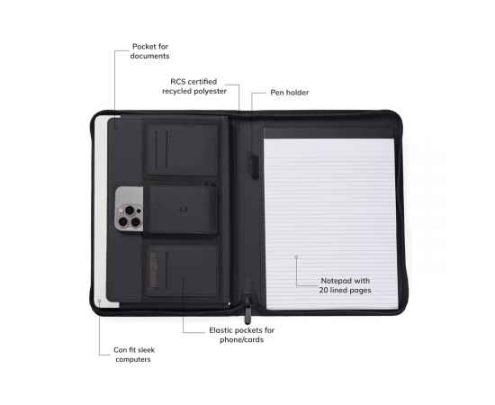Возьмите с собой самое необходимое с помощью стильного и вместительного органайзера VINGA Baltimore. В нем все предусмотрено: держатель для ручки, отделение для документов, карманы для карточек и смартфона, блокнот из 20 линованных листов для заметок. Кстати, блокнот легко вынуть и заменить, поэтому срок службы органайзера не ограничен. Товар частично сделан из переработанных материалов, сертифицированных RCS. Сертификация RCS гарантирует, что вся цепочка поставок была проверена и подтверждена.
