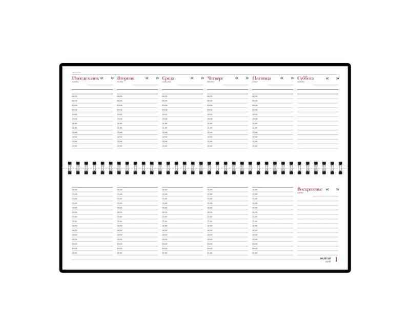 Недатированный планинг выпускается размером 305*130 мм и содержит 128 страниц (блок 292 х100 мм). Для них выбрана высококачественная белая бумага плотностью 70 грамм. Разворот представляет собой разметку на 7 дней недели с графами с указанием времени. Месяц и день недели указаны на русском и английском языках. Первые 15 страниц содержат справочные сведения из различных областей на русском языке. Крепление листов на открытом гребне способствует быстрому переходу по страницам.
