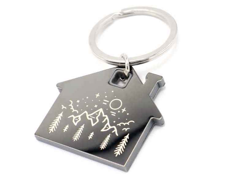 Брелок дом имеет эффектное темное покрытие. Эта модель отлично подойдет в качестве промосувенира для компаний любых отраслей