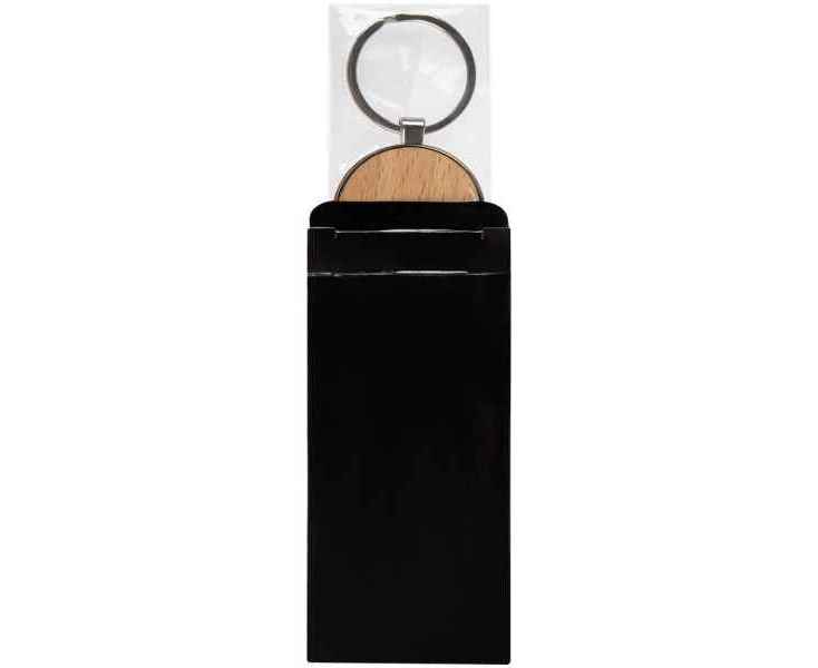 Металлический брелок-медальон со вставкой из натурального дерева. Подойдет для клиентов, отдающих предпочтение качественным натуральным материалам.