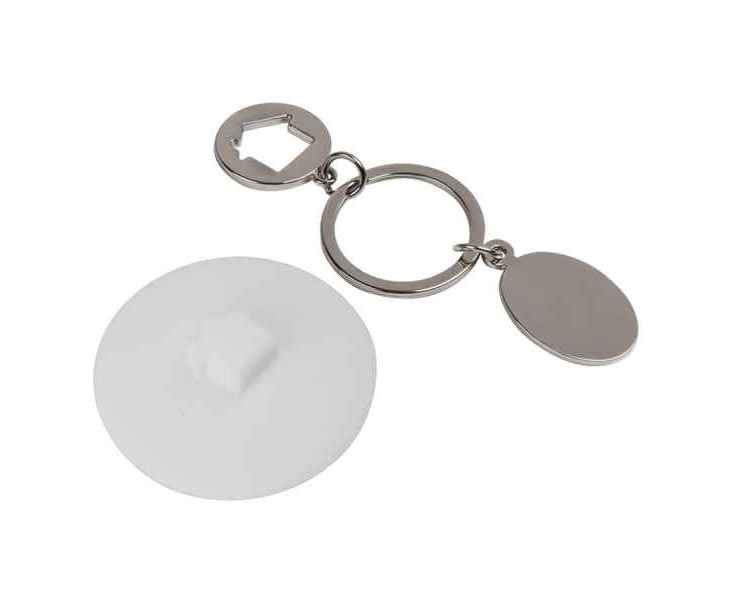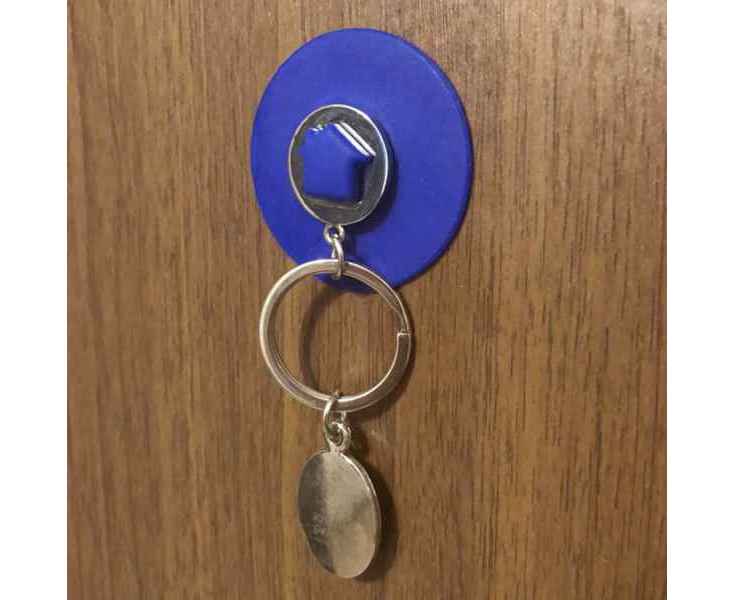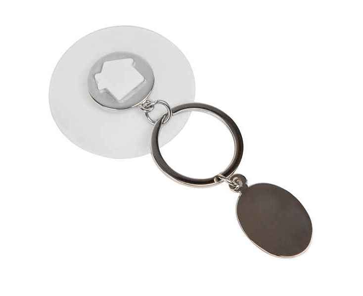 Брелок с присоской для гладких поверхностей. Металлическая пластинка, которая крепится на присоску,подходит для разблокировки тележек в супермаркете. Металлический шильд для гравировки.