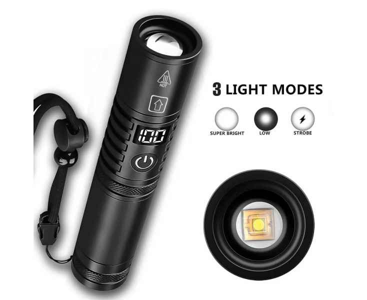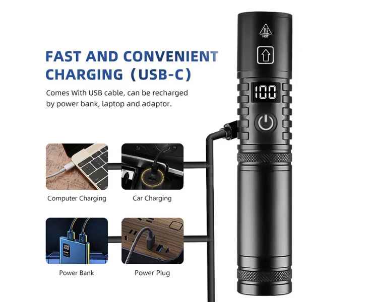 Алюминиевый корпус, электронный дисплей и универсальная зарядка Type-C — всё для надёжной работы в любых условиях. Аккумуляторный фонарь с режимами яркости и стробоскопом, подходит для дома, автомобиля и активного отдыха.