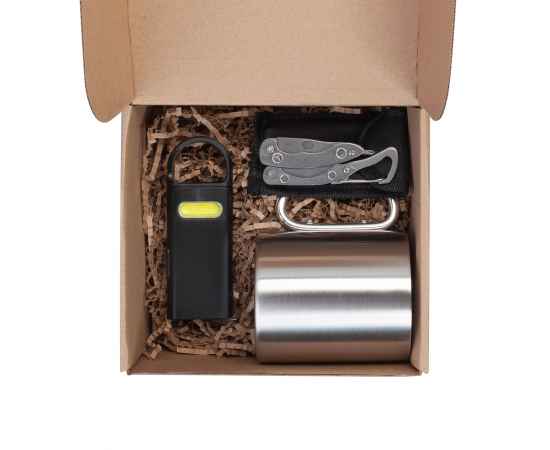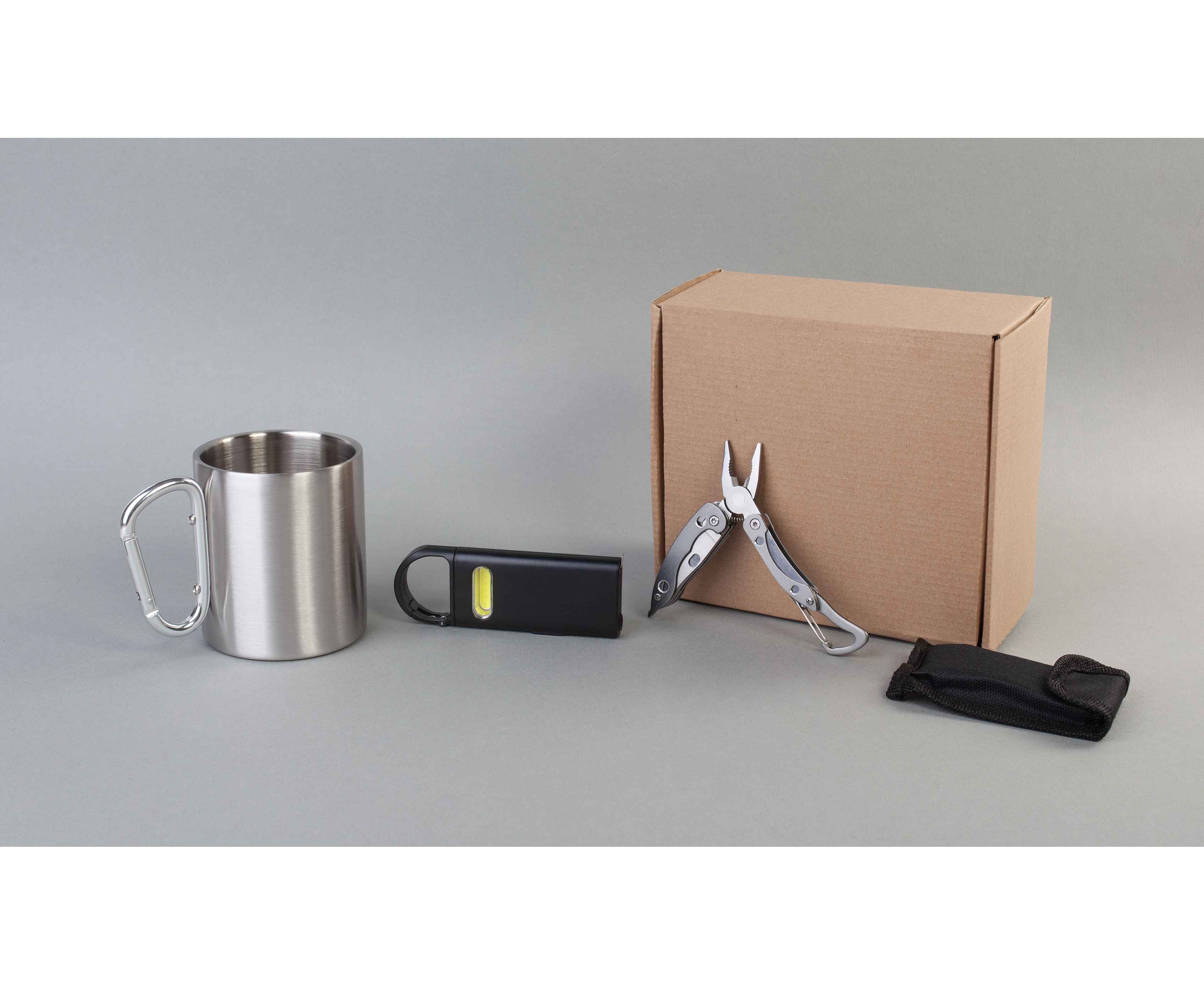 В набор входит: кружка "Огайо" 1032  (объем 300 мл, размер 9 х d 7,5 см); мультитул "Duty" 9в1 5420-7  (размер 8,4 х 1,3 х 2,8 см); фонарик "Spark" 6799 (размер 4 х 11,2 х 1,4 см);  гофрированный 30 гр, крафт (плотность 80...
