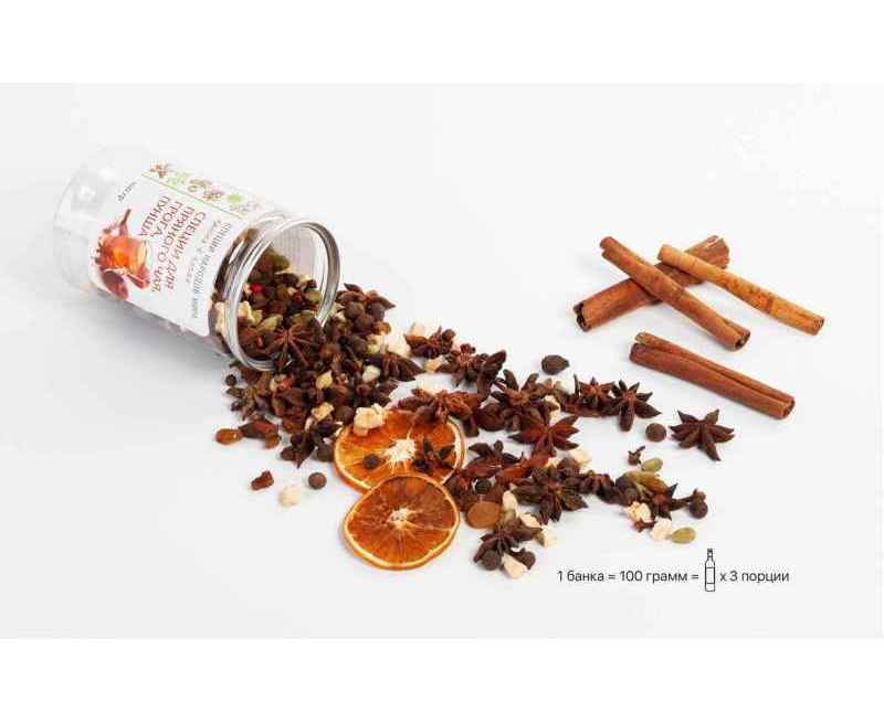 • специи для глинтвейна, пряного чая, пунша, грога 100 гр (3 порции: палочки корицы, бадьян, гвоздика, кардамон, изюм, яблоки сушеные, перец душистый, апельсины сушеные кольцами, перец розовый); h 11 х d 7 см;