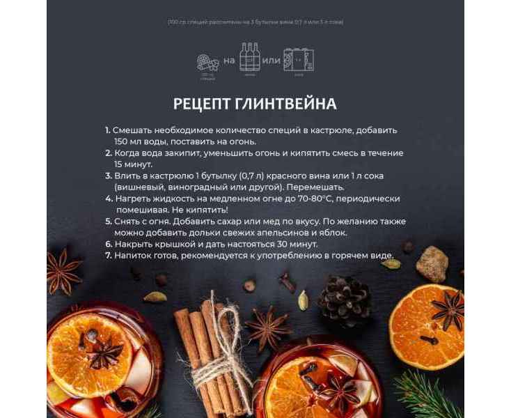 • специи для глинтвейна, пряного чая, пунша, грога 100 гр (3 порции: палочки корицы, бадьян, гвоздика, кардамон, изюм, яблоки сушеные, перец душистый, апельсины сушеные кольцами, перец розовый); h 11 х d 7 см;