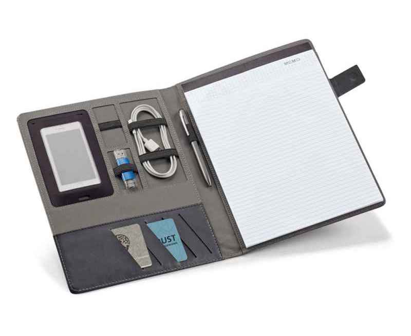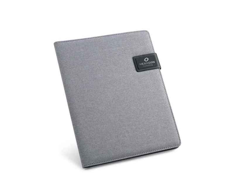 Папка A4 из искусственного льна и кожзаменителя. Имеет застежку на магните с пластинкой для персонализации. Внутри имеет блокнот из 20 листов в линейку, держатель для шариковой ручки (ручка не входит в комплект), карман для смартфона и держатели для кабелей или других принадлежностей (в комплект не входят). 233 x 310 x 18 мм | Пластина: 50 x 30 мм. Вид нанесения, рекомендуемый поставщиком: трансфер, гравировка.