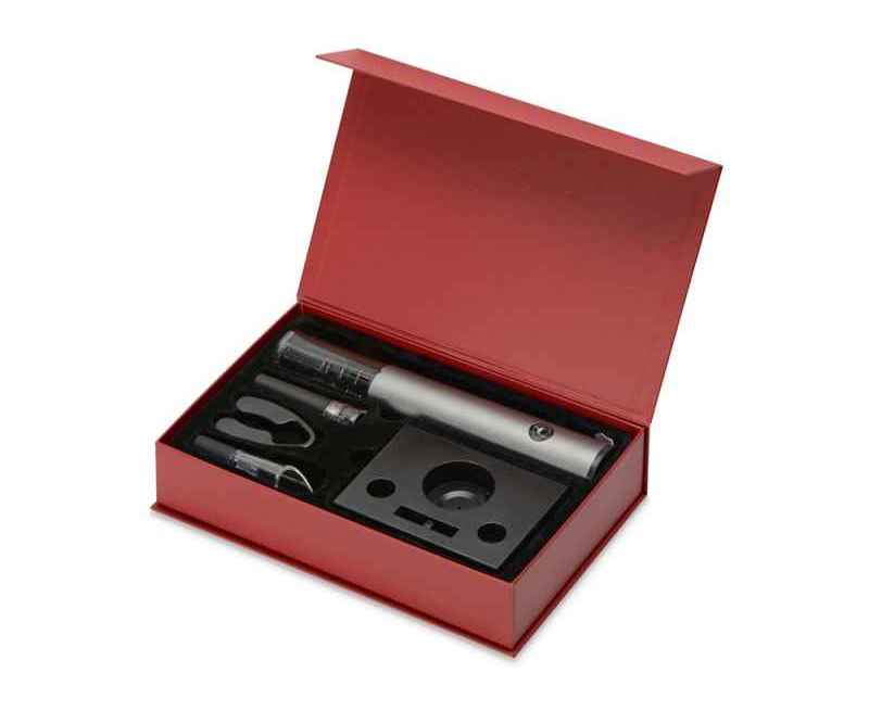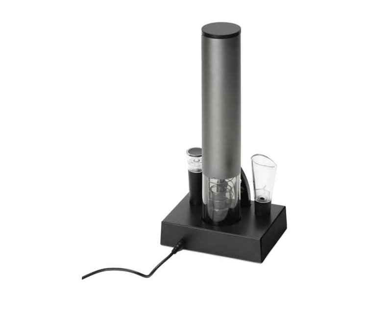 Штопор подзаряжается от док-станции, которая позволяет эффектно разместить винные аксессуары из набора, а также при использовании штопор подсвечивается, что прекрасно видно сквозь прозрачную нижнюю часть — превратите подготовку вина в настоящее зрелище! От вас не требуется никаких усилий: просто правильно разместите штопор поверх горлышка и слегка прикоснитесь к сенсорной кнопке, а если процесс не кажется вам очевидным — поможет инструкция, которая приложена к набору. О том, насколько штопор заряжен, расскажет цвет индикатора заряда: зеленый (полностью заряжен), синий (достаточно заряжен) или красный (требуется зарядка). Кстати, штопор можно использовать и с батарейками типа АА (4 штуки), но с ними запрещается устанавливать штопор на док-станцию.