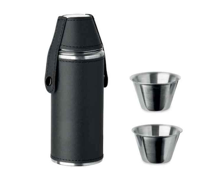 Фляжка из нержавеющей стали с поверхностью из искусственной кожи и 2 стаканчика из нержавеющей стали объемом 20 мл. Емкость фляги: 230 мл.