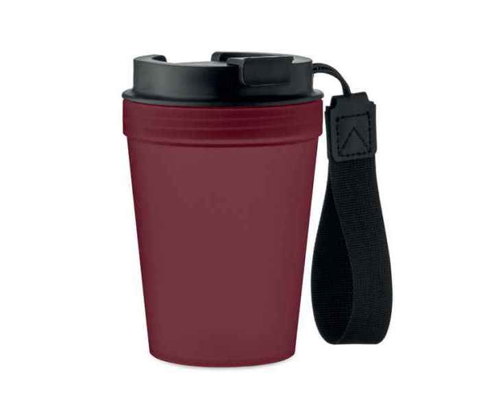 Одностенная пластиковая термокружка с ремешком из полиэстера RPET. Герметичная. Емкость: 300 мл. Стенки кружки могут нагреваться.