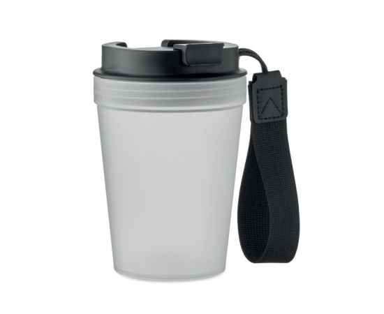 Одностенная пластиковая термокружка с ремешком из полиэстера RPET. Герметичная. Емкость: 300 мл. Стенки кружки могут нагреваться.