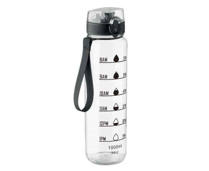 Спортивная бутылка из RPET с указанием графика потребления воды, откидной крышкой с предохранительным замком от открывания и ремешком для переноски. Герметичная. Емкость: 1 л.
