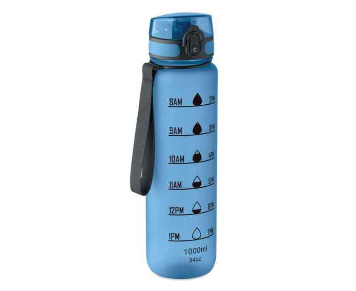 Спортивная бутылка из RPET с указанием графика потребления воды, откидной крышкой с предохранительным замком от открывания и ремешком для переноски. Герметичная. Емкость: 1 л.