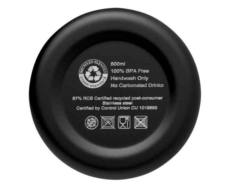 Бутылка из нержавеющей стали, сертифицированная RCS, с медной вакуумной изоляцией и лаконичным дизайном. Изолированная конструкция из нержавеющей стали предотвращает образование конденсата внутри бутылки, а модное матовое порошковое покрытие делает бутылку особенно прочной. Не содержит БФА, протестирована и одобрена в соответствии с немецким законодательством о безопасности пищевых продуктов (LFGB). Проверена на содержание фталатов и одобрена для использования в соответствии с правилами REACH. Объем 500 мл. Рекомендуется мыть вручную. Поставляется в подарочной коробке из переработанного картона. Recycled stainless steel.