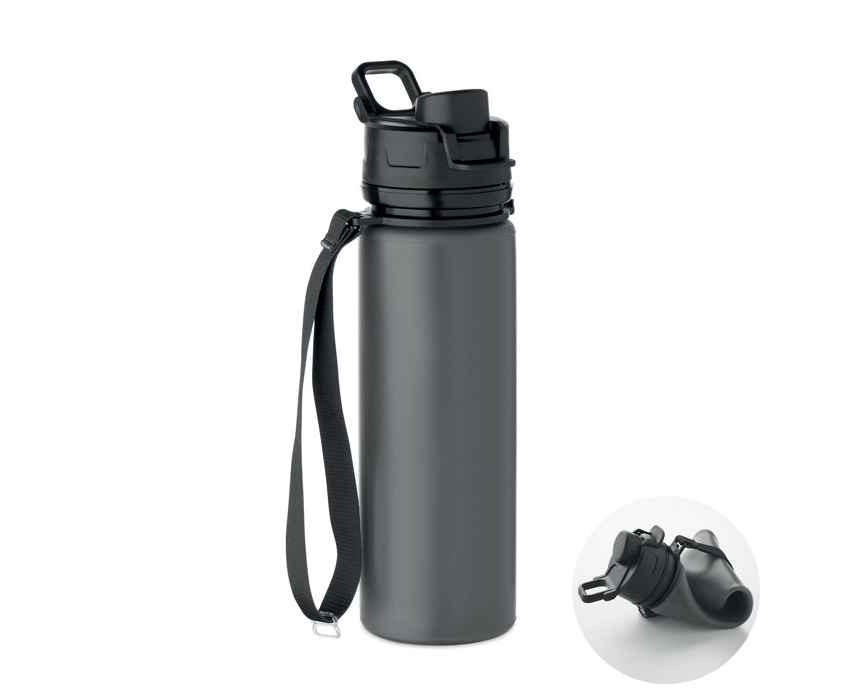Складная силиконовая спортивная бутылка с крышкой из полипропилена (PP), ручкой, полиэстеровым ремешком и прозрачной застежкой для фиксации в сложенном виде. Герметичная. Объём: 500 мл.