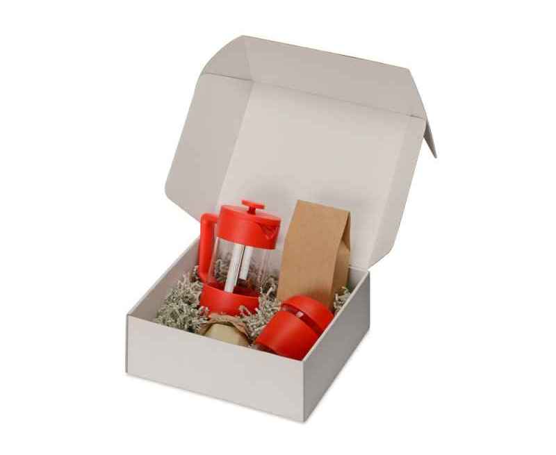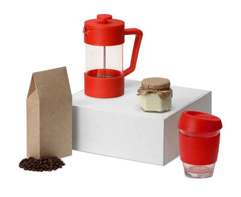 Набор Бодрое утро содержит все необходимое для действительно приятного пробуждения. В нем вы найдете все, что нужно для приготовления вашей первой чашечки кофе с утра: френч-пресс, упаковку робусты темной обжарки, стакан с силиконовыми деталями и баночку крем-меда, который составит прекрасную пару крепкому напитку. Набор упакован в белую картонную коробку и переложен бумажным наполнителем.