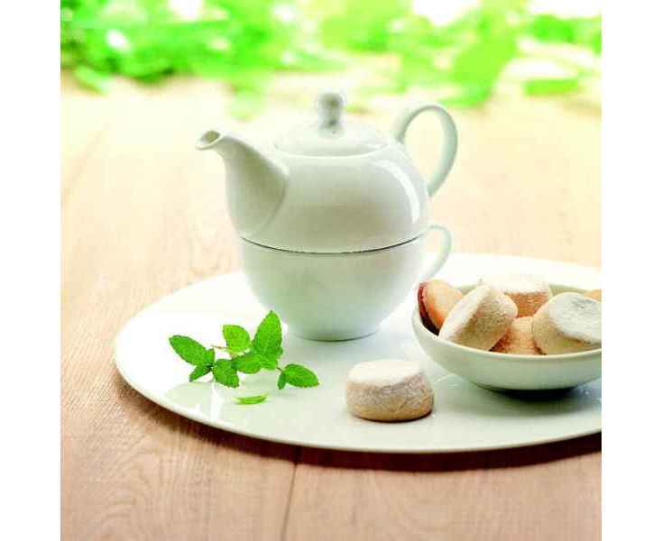 Чайник объемом 400 мл и чашка из белой керамики. Упаковка - черная подарочная, картонная. Тампопечать: нельзя мыть в посудомоечной машине. Деколь: можно мыть в посудомоечной машине.