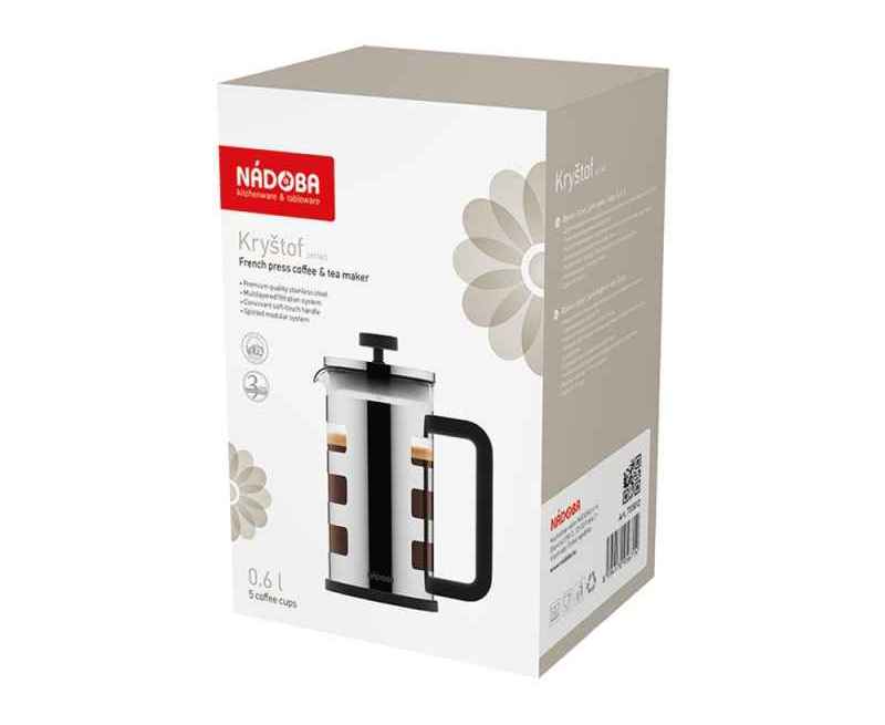 Френч-прессы серии Kryštof имеют колбу, выполненную из жаропрочного боросиликатного стекла. Прочный подстаканник из нержавеющей стали с пластиковой подставкой обеспечивает дополнительную термоизоляцию и предохраняет колбу от повреждений. Многослойная система фильтрации френч-прессов выполнена из высококачественной нержавеющей стали 18/10. Удобная ручка с покрытием Софт-тач не нагревается и не выскальзывает из рук. Разборная конструкция изделий и системы фильтрации облегчают легкий и качественный уход. В комплекте предусмотрена мерная ложка 7г для точной дозировки продуктов. В серию входят френч-прессы объёмом 1 и 0,6 л. Гарантия на френч-прессы серии Kryštof 3 года.