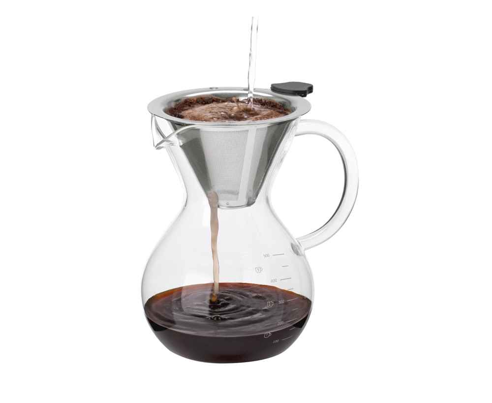 Большой объём позволяет заварить до 500 мл кофе за раз — это две стандартных порции. Жаропрочное боросиликатное стекло отлично переносит перепады температуры, а удобная ручка не нагревается, поэтому можно сразу разливать горячий напиток.