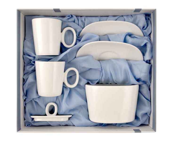 В комплекте 2 кофейных пары и сахарница.
