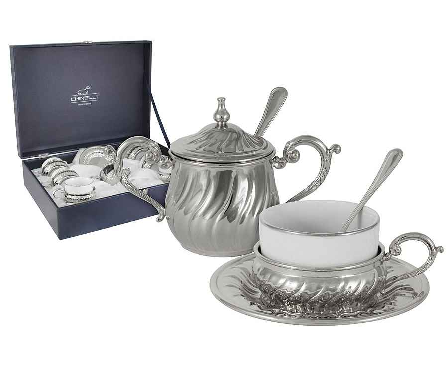 Элитные наборы для горячих напитков считаются традиционными подарками молодожёнам, юбилярам или близким людям, начинающим новый жизненный этап. Наибольшей востребованность пользуются красивые чайные сервизы на 6 чашек , ведь они символизируют уют и домашнее тепло. Изделия итальянской компании Chinelli придадут даже самому обычному чаепитию особой атмосферы элитарности и сделают любой напиток намного вкуснее. Коллекция CHINELLI – это плавные линии, безупречное качество и оригинальный дизайн. Изящная отделка серебром делает каждый предмет идеальным украшением вашего интерьера. Марка CHINELLI это 40 лет бесценного опыта ручного производства, безупречного итальянского вкуса и европейского качества. Бренд воплощает в себе стиль и качество, соответствующий стандарту 'Made in Italy'. Компания расположена в долине Lumezzane провинции Brescia (Италия), которая с давних времен славится высоким мастерством в области обработки металла. На протяжении многих лет компания совмещает искусную работу ремесленников с промышленным производством. Характерной чертой CHINELLI является внедрение новейших технологий и способность быстро адаптироваться к изменчивости потребности рынка. Изделия марки CHINELLI с легкостью превратят встречу с друзьями в непревзойденную атмосферу праздника и уюта. Они отличаются безупречным качеством, роскошью исполнения и одновременно классической простотой стиля. Изделия изготавливаются из хрусталя, стекла, металла и даже фарфора, в декорировании используется покрытие серебром и золотом, инкрустация кристаллами Swarovski. Все изделия упакованы в фирменную подарочную упаковку с логотипом CHINELLI и сертификатом внутри.