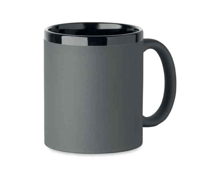Керамическая кружка с покрытием soft touch, черной внутренней частью и ободком. Подходит для гравировки. Емкость: 300 мл. Упакована в белую картонную коробку.