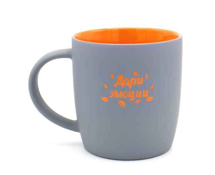 В кружке Spring под покрытием софт-тач слоя нанесен слой глазури такого же цвета, что и внутри; и при гравировке вы получаете яркое цветное изображение.