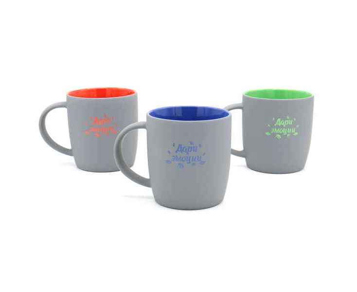 В кружке Spring под покрытием софт-тач слоя нанесен слой глазури такого же цвета, что и внутри; и при гравировке вы получаете яркое цветное изображение.