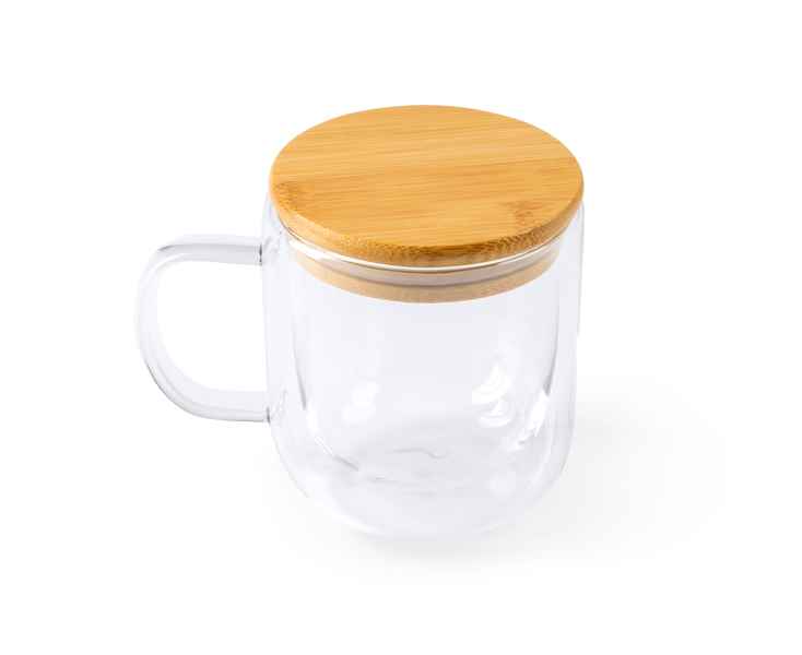 Красивая кружка с двойными стенками из боросиликатного стекла с бамбуковой крышкой. Объем 280 мл.