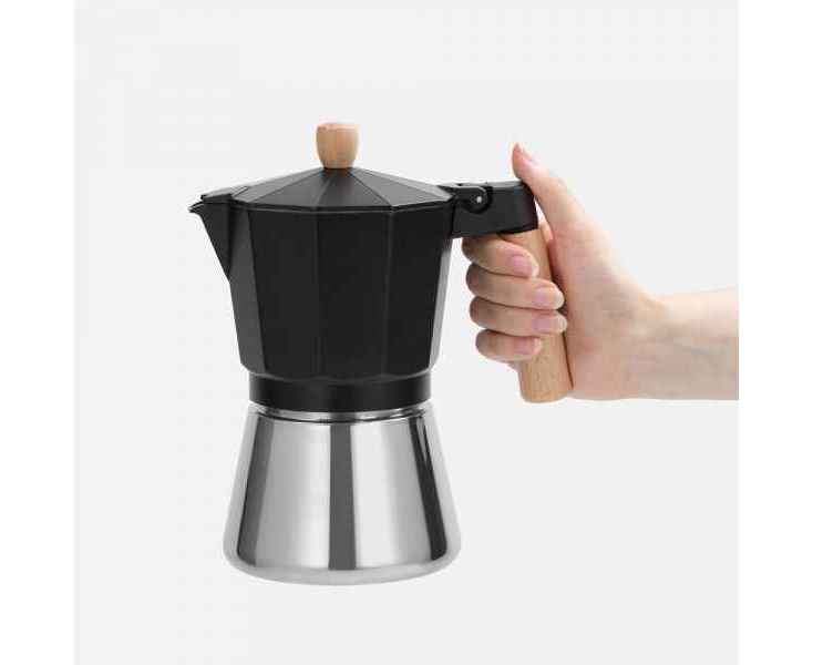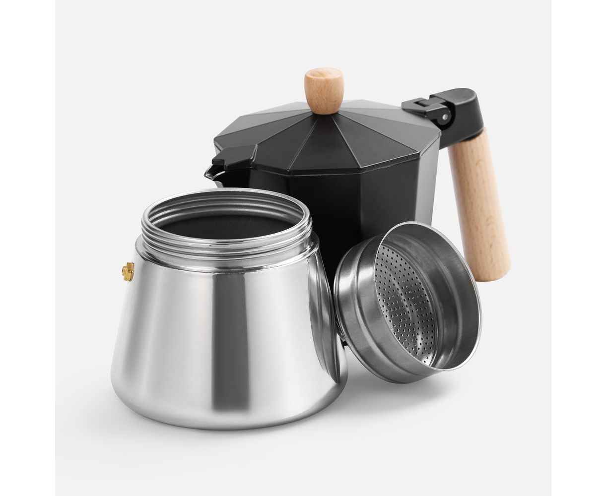 Верхняя часть выполнена из окрашенного алюминия, а нижняя — из нержавеющей стали с зеркальной полировкой, что обеспечивает долговечность и стильный внешний вид. Удобная деревянная ручка не нагревается —комфорт и безопасность при использовании гарантированы. Эта кофеварка позволит быстро и легко приготовить классический эспрессо, чтобы наслаждаться свежим крепким кофе снова и снова.