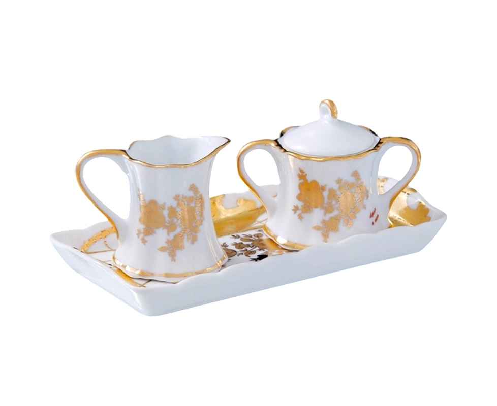 Набор 'Мелисса' включает элегантный молочник, сахарницу и блюдце, выполненные из высококачественной керамики или фарфора. Изделия украшены нежным и изысканным дизайном с мотивами мелиссы или растительных орнаментов, что создает атмосферу уюта и гармонии. Молочник идеально подходит для подачи молока или сливок к кофе и чаю, а сахарница — для хранения сахара или сладостей. Блюдце служит удобной подставкой для сахарницы или для сервировки десертов. Этот набор станет прекрасным дополнением к сервировке стола .
