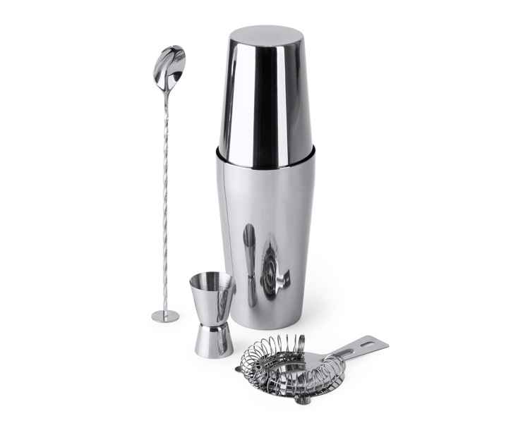 Набор для коктейлей из нержавеющей стали. Включает мерный стакан, шейкер объемом 580 мл, ситечко и ложку. В комплект входит сумка для переноски.